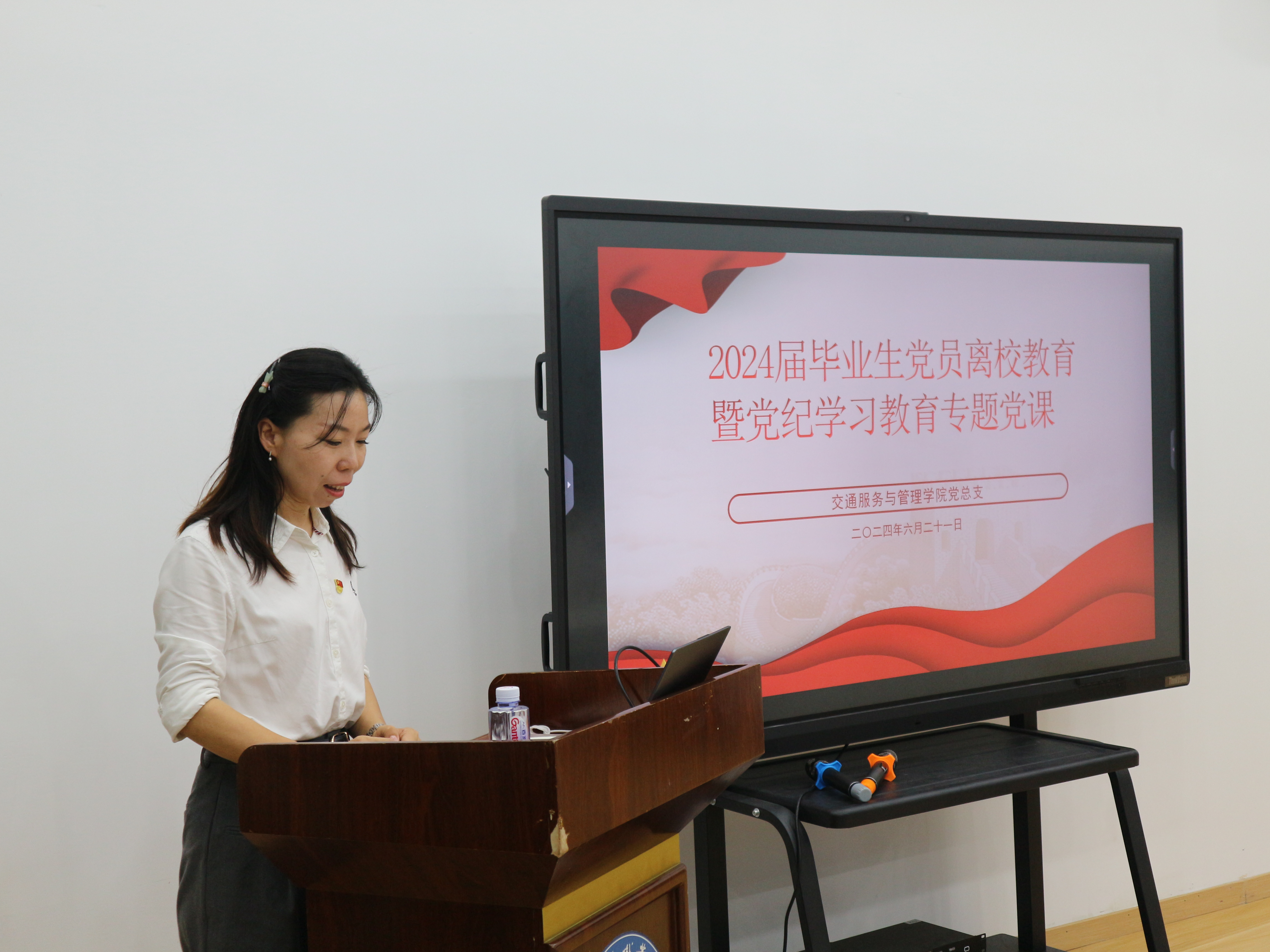 本网讯(通讯员 张钰培)6月21日下午,交通服务与管理学院在学校“一站式”学生社区开展2024届毕业生党员“最后一堂党课”主题教育。武汉交通职业学院副校长胡琴以“严明党的纪律规矩,展新时代大学生党员风貌”为题讲授专题党课。学院党总支书记孙真、团总支书记贾佳霖、第一学生党支部书记佟安安、辅导员盛君凯以及第一学生党支部全体毕业生党员参加。