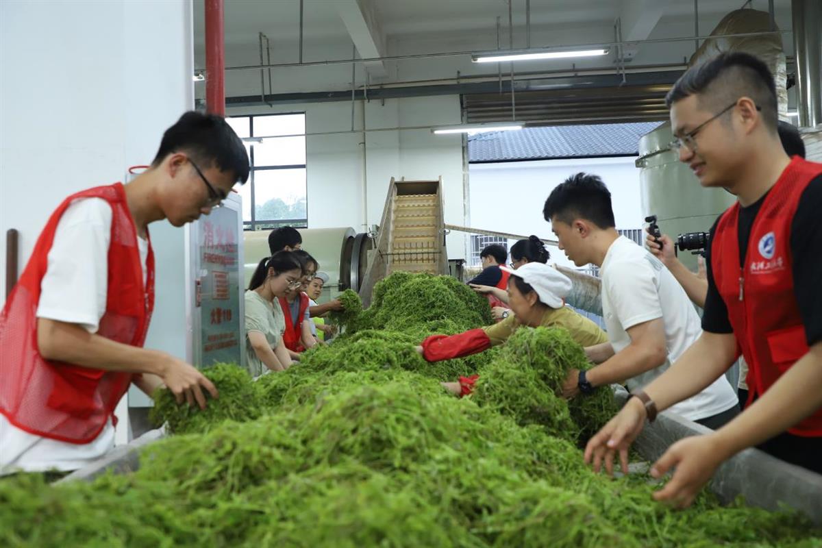 小小来凤滕茶托起老乡们大大致富梦,满山的滕茶绿浪起伏,实践团成员手提竹篮体验采摘藤茶的欢乐,走进藤茶加工基地,实地体验藤茶制作工艺。他们认真采摘鲜嫩芽叶,用心揉捻茶叶,仔细观察烘焙火候,沉浸式领略非物质文化遗产的独特魅力。