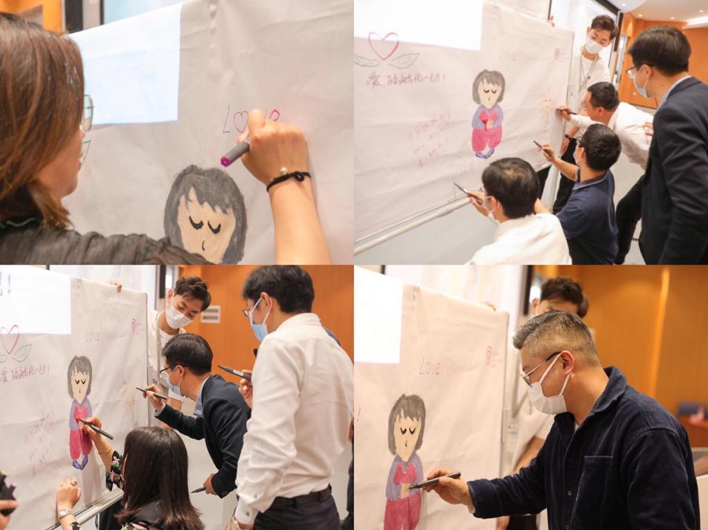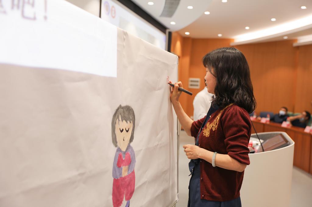 开幕式的结尾也是本届心理健康月的开始,大学生心理健康执行委员会的同学推出一幅画,一个小女孩抱着膝盖埋头低落着,生动地展现了一些学生在被纷杂的人际关系和数不尽的压力笼罩之下的孤独与无助,方爱荣带领全体参会师生共创一幅图——《帮帮困难中的TA》,师生们一同为这幅画增添温暖与幸福的力量、写下对他(她)的寄语。每个人都曾遭遇过人生中的至暗时刻,但就像画板中一样,当有人添上一束光、一句关心、一声问候或是静静地倾听与陪伴,就能帮他(她)重拾希望,勇敢生活。
