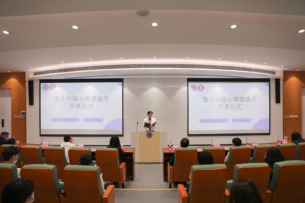 主持人张兴瑞老师介绍了本届心理健康月的主要活动:“以书为阶,共话心灵”《心理读书会》活动;“愈见美好,心向未来”《创意口罩评选》活动;包含团队建设、压力应对、人际交往、生命教育四个主题板块的系列《心理委员培训》活动;《生命的绿程》绿植培育活动;《故事的故事》故事续写活动;新一届《十佳心理委员评选》活动以及共包含10个子活动的《心理游园会》。