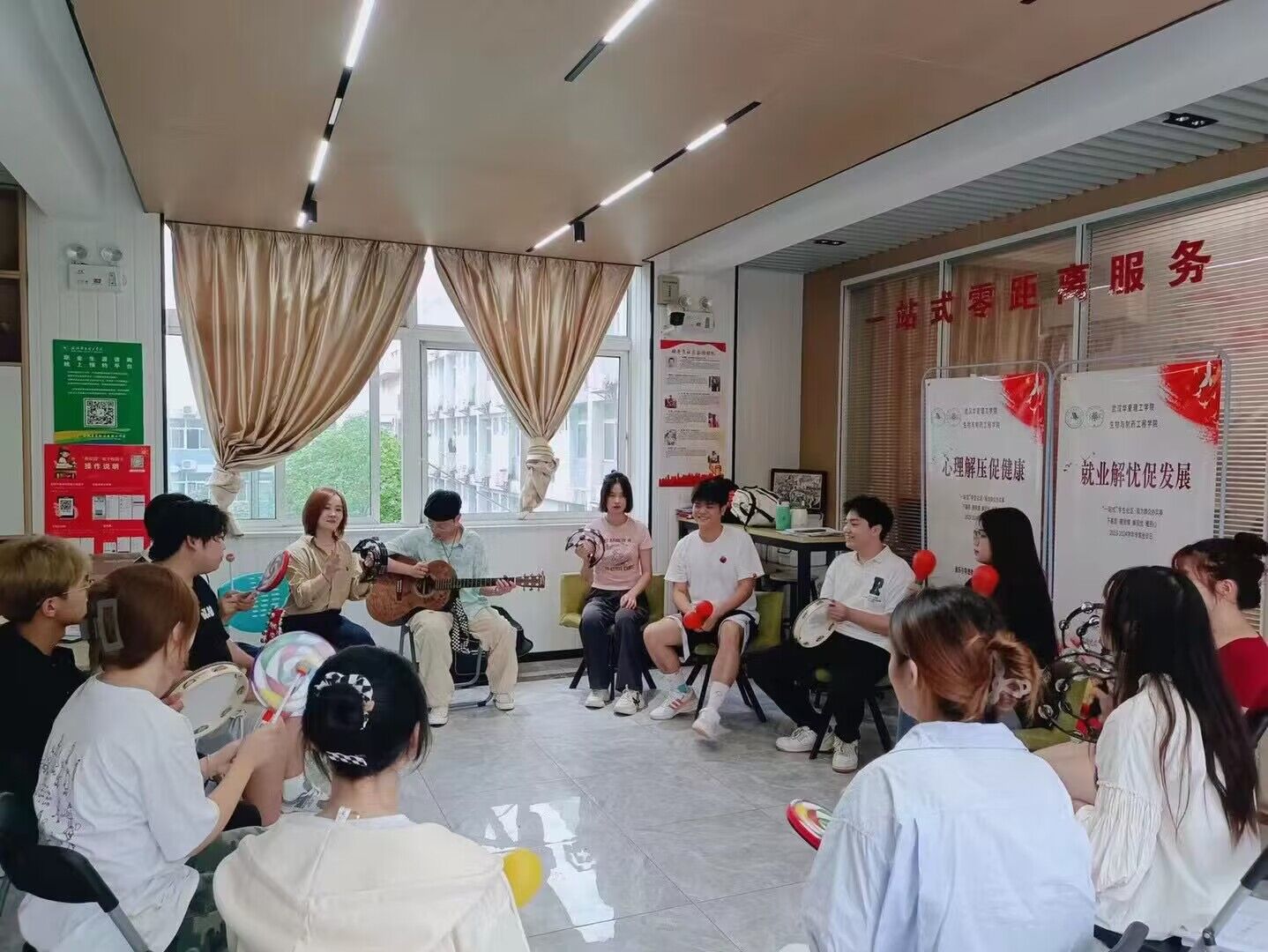 武汉华夏理工学院:音乐引导想象--构建美好内心世界2023-09-18为消除新生紧张焦虑的情绪,促进健康心理,缓解学生压力,武汉华夏理工学院生物与制药工程学院于近日在七号楼四楼学生社区组织音乐促健康心理解压活动。
