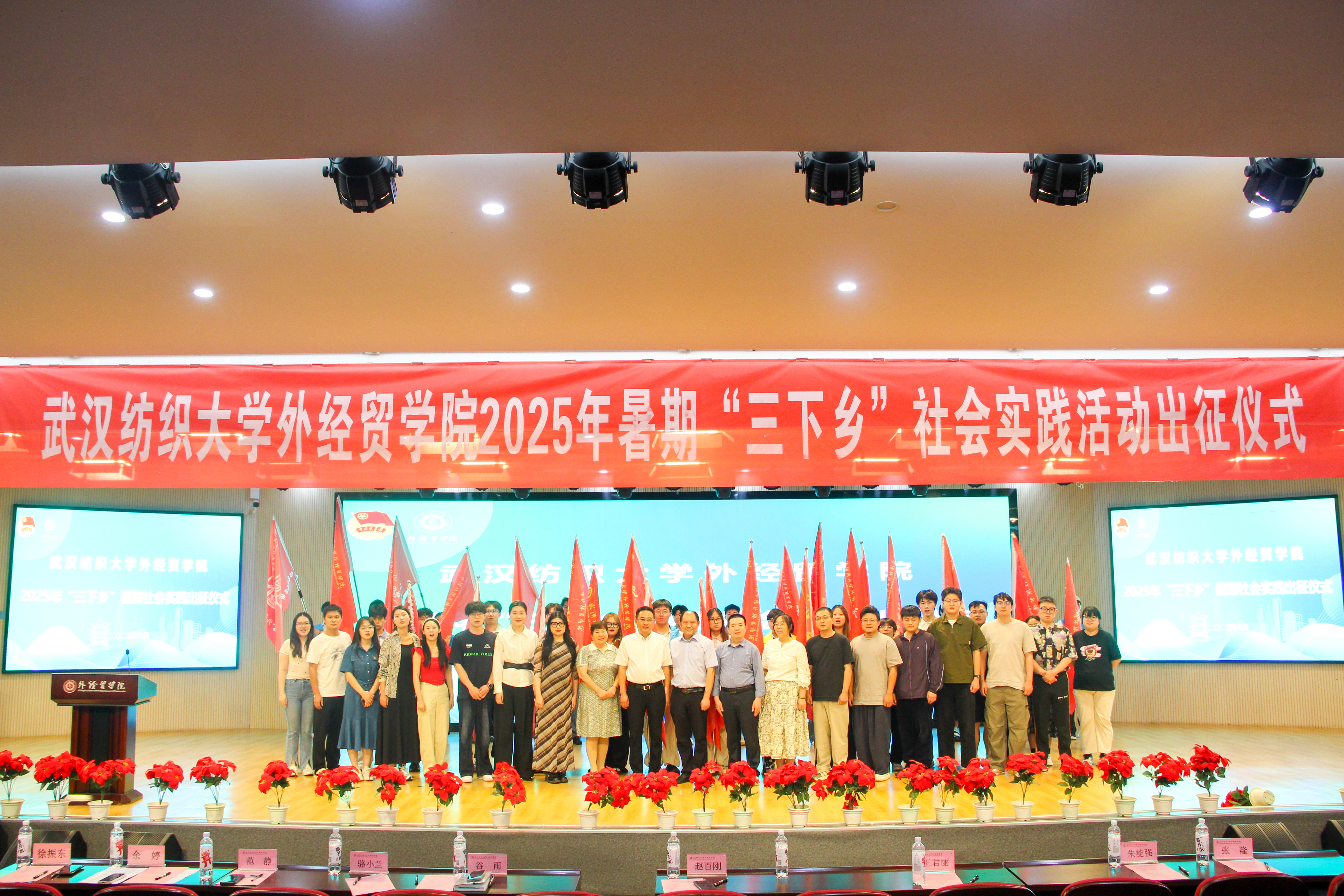 武汉纺织大学外经贸学院:成功举行2025年“三下乡”暑期社会实践活动出征仪式2025-06-23为深化实践育人体系建设,推动青年学子将专业知识与基层实践深度融合,武汉纺织大学外经贸学院于6月20日在学术报告厅举行2025年“三下乡”暑期社会实践出征仪式。校党委副书记赵百刚,党委学工部部长徐振东,党委学工部副部长、校团委书记余婷,各学部党总支书记、分团委书记及团队指导老师出席,150余名学生参与,本次活动由党委学工部部长徐振东主持。 -