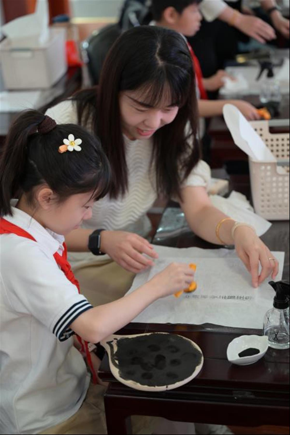 带上《流水》的曲谱,孩子们又走入了拓印小课堂,了解这项中国古老技艺,认识传拓的工具,亲手体验传拓工艺。孩子们和家长合作,一起喷水上纸、扫纸、上墨,在紧张与期待中,沉浸式体验和感受了荆楚文化的历史底蕴和无穷魅力,揭开拓印好的减字谱,大家也是成就感满满。该校二年级(2)班的胡睿恒感叹道:“这真是一次神奇的体验,千年之前的乐器原来这么有趣,这真是我们国家了不起的宝藏!”